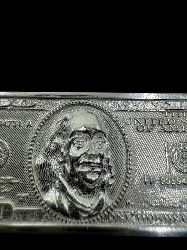 Setze ein starkes Statement mit diesem einzigartigen Geldanhänger im 100-Dollar-Design. Gefertigt aus echtem 925er Sterling Silber, überzeugt dieses Schmuckstück durch seine hochwertige Verarbeitung und detailreiche Gravur, die den ikonischen Dollarschein perfekt widerspiegelt.