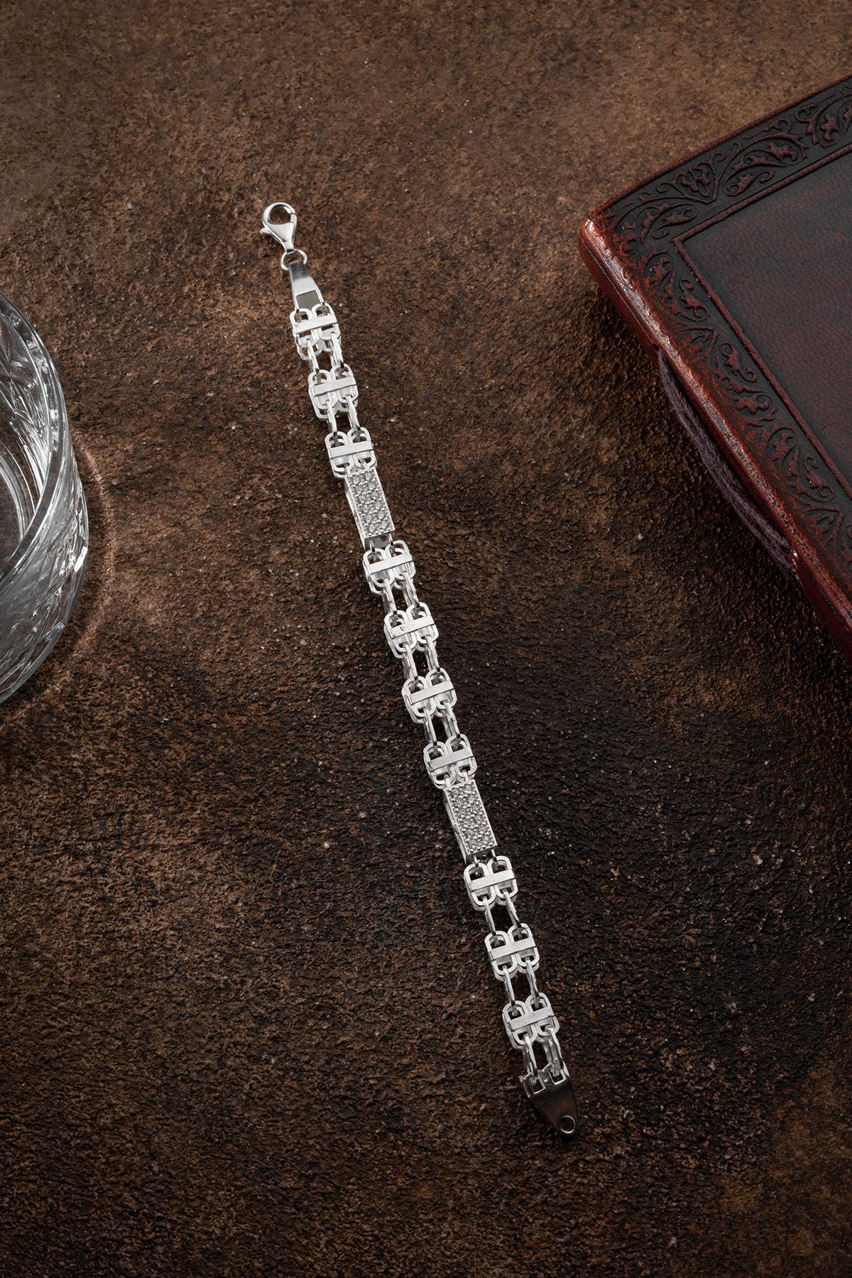 Mit einer Breite von 8,5 mm bietet das Käfigkettenarmband eine auffällige Präsenz am Handgelenk, ohne dabei zu überladen zu wirken. Die einzigartige Käfigstruktur, die dem Armband seinen Namen gibt, besteht aus miteinander verwobenen Silbergliedern, die eine besondere Textur und Tiefe erzeugen. Diese Struktur verleiht dem Käfigkettenarmband eine robuste und dennoch flexible Form, die sich angenehm dem Handgelenk anpasst.